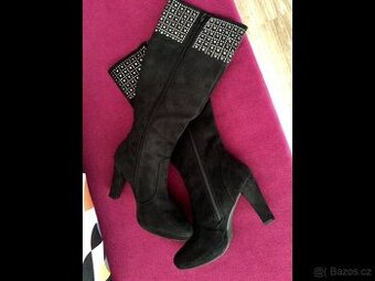 Elegantní kozačky s pěkným designem. Semišová kůže. Výška podpatku 10 cm. Obvod přes lýtko 36-38 cm.
