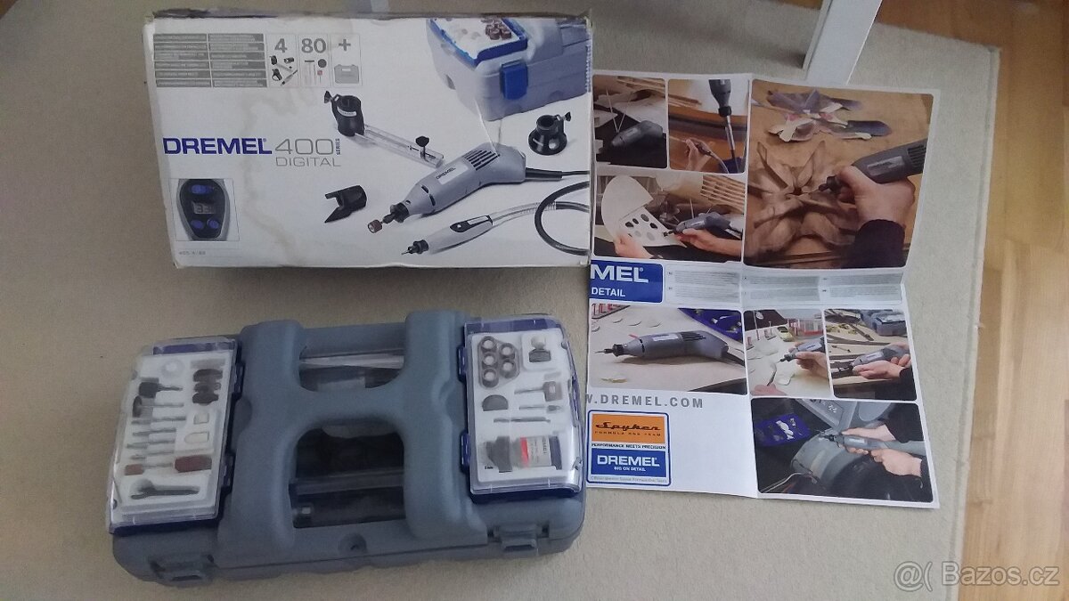 Dremel 400 Series Digital, starší, ale minimálně použitý, většina příslušenství nepoužité. Se 2 miniboxy s příslušenstvím a 4-mi příslušenstvími Dremel v prostorném a velmi praktickém úložném boxu. Kuft je bez plastových uzavíracích spon, které zkřehly a prasky, viz foto, přikládám. Digitálně nastavitelné otáčky 5-33000ot./min., závěsné očko. Prodávám pouze to co je na foto