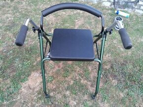 Chodítko čtyřkolové s opěrkou a košíkem, skládací Zánovní, minimálně použité Nastavení výšky rukojeti 76 - 86 cm Výška sedáku od země 53 cm Kolečka jsou odnímací, lze tedy použít i jako chodítko pevné