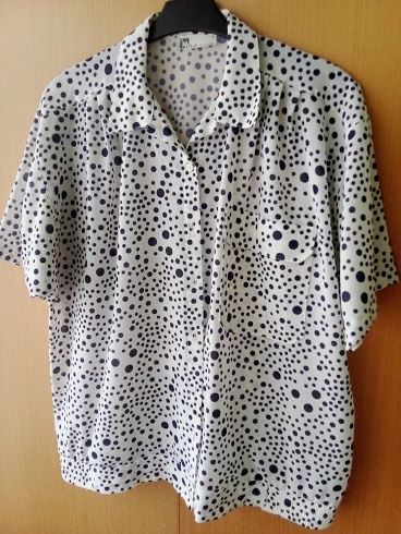 Lehká bílá halenka s tmavěmodrými puntíky, s krátkým rukávem, s kapsičkou na předním díle, rozzpínání na knoflíčky, dole lemovaná širším lemem. Vhodná pro silnější postavu.rozměr přes prsa 2x 65 cm, délka 70 cm. (3XL)