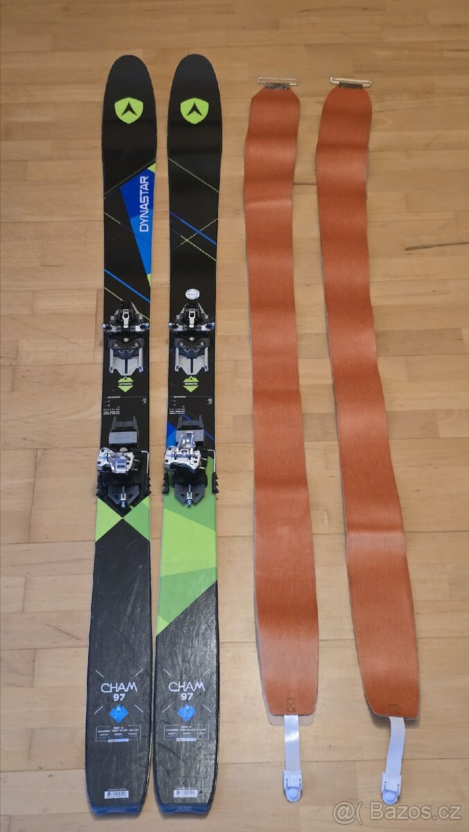 Skialpový set (lyže + vázání + pásy). Lyže Dynastar Cham 97 mm střed, 17 m radius - univerzální all mountain of prašanu až na sjezdovku. Tech (pin) vázání Dynafit Radical ST 2.0 (brandované Look), mohérové stoupací pásy. Vázání namontované na desce, takže je možný značný rozsah velikostí bot. Vše v dobrém stavu, pouze kosmetické oděrky. Po velkém servisu, připraveno k použití. Případně možno i s lyžáky Dynafit Radical Pro (MP 295 / 29,5).