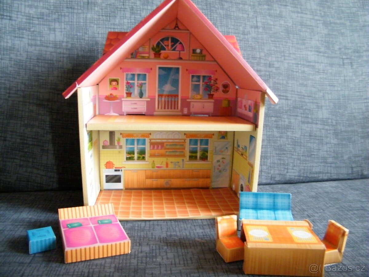 Dvoupatrový domeček z laminovaného pevného kartonu, včetně nábytku, velikost 30x39x14 cm. Pořizovací cena 300 Kč.