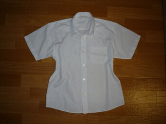 Bílá chlapecká košile Marks&Spencer vel 128 s krátkým rukávem, na prsou malý kazík způsobený asi přišpendlenou ozdobou na svatbě, jinak velmi pěkný stav délka košile 51cm, šířka v podpaží 2x40cm