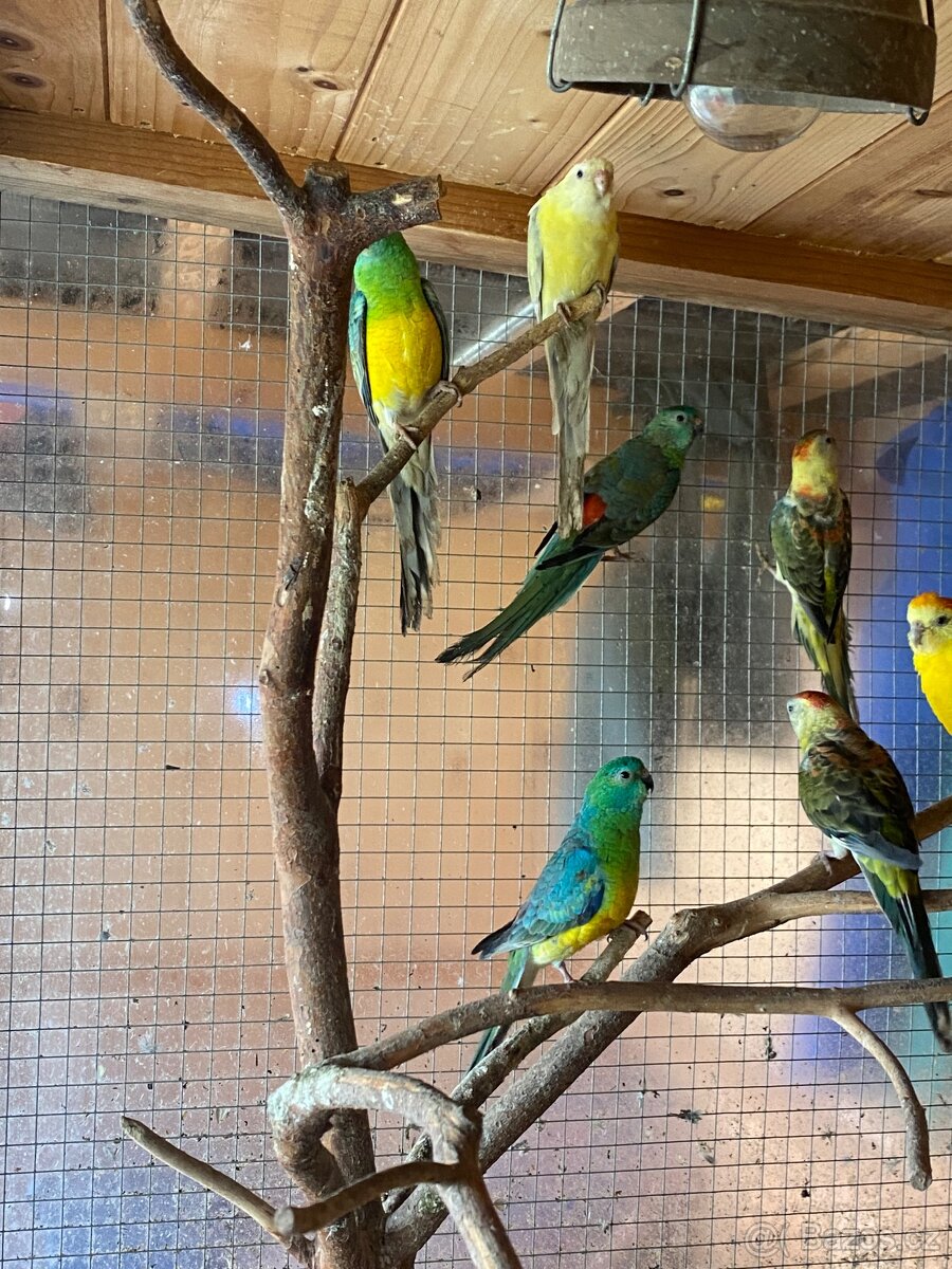 Prodám loňské papoušky zpěvavé, 3 samečky a 3 samičky odchované ve venkovní voliéře.