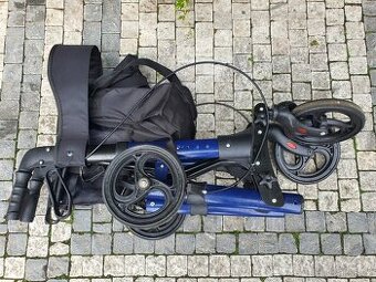 Moderní odlehčené chodítko. Příjemně se na něm sedí díky zádové opoře. Má nenafukovací kolečka, variabilní výšku rukojetí. Jde složit do malých rozměrů.