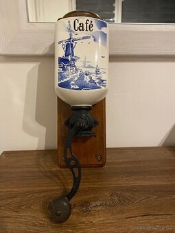 Starožitný nástěnný mlýnek na kávu Mutzig Tramont – cca 1. polovina 20. století Starý nástěnný mlýnek na kávu s porcelánovou nádobou s dekorem „Café“ (modrý motiv větrného mlýna). Na dřevěné zadní desce původní štítek Mutzig Tramont. Období: pravděpodobně 1. polovina 20. století (cca 1920–1940). Provedení: dřevěná zadní deska, litinový mlecí mechanismus, porcelánová násypka, původní klika s dřevěným úchopem. Stav odpovídá stáří – běžné známky používání. Skleněná spodní násypka (zásobník na namletou kávu) není součástí prodeje, protože je poškozená a je potřeba ji přilepit. V případě zájmu ji mohu přiložit k mlýnku. Vhodné jako stylová dekorace do kuchyně, kavárny nebo pro sběratele starých kuchyňských předmětů. Osobní předání možné / zaslání po domluvě.