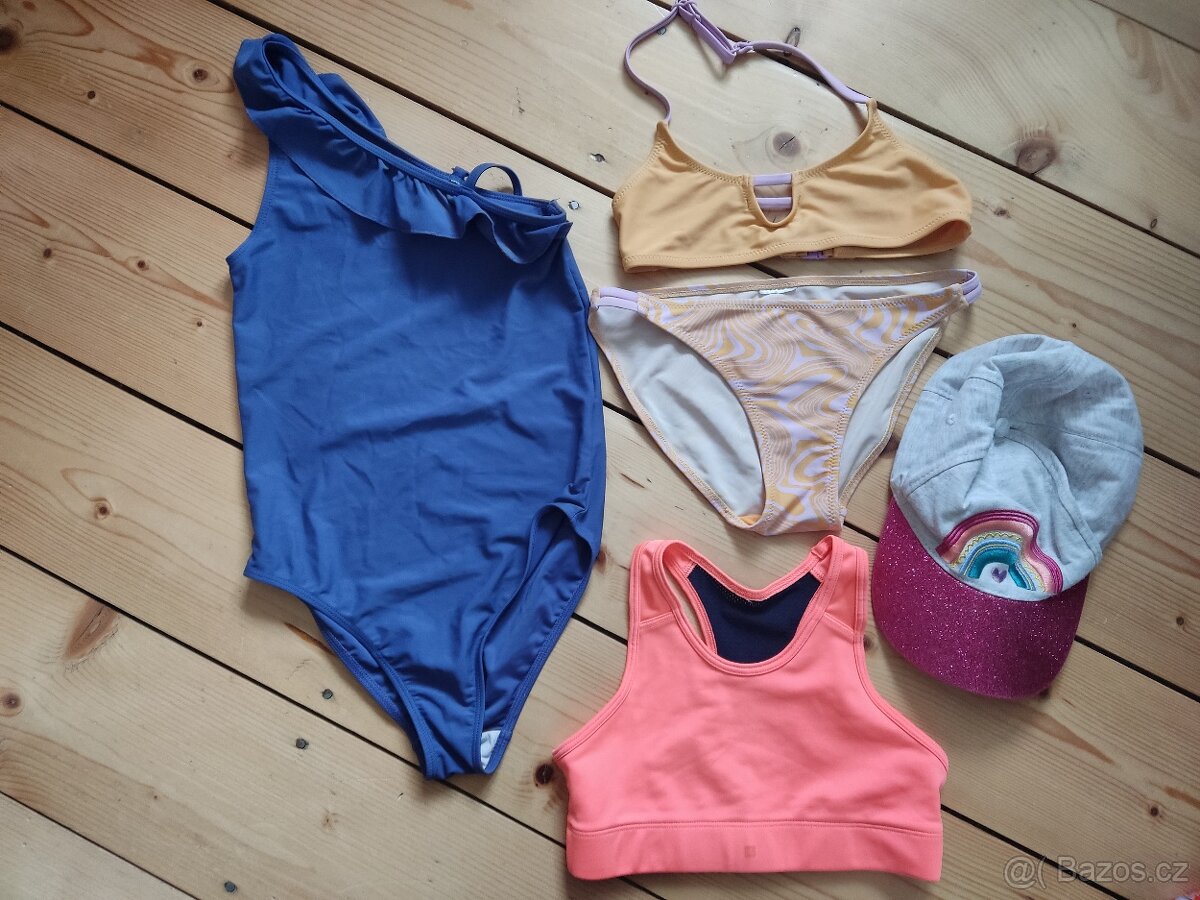 Dívčí plavky velikost 134-140. Cena jednodílné 45kč, dvoudílné 15kč. Sportovní podprsenka velikost 134-140 cena 35kč. Kšiltovka nastavitelná, zakladní obvod 54cm - cena 20kč. Vše spolu jako komplet 90 kč.