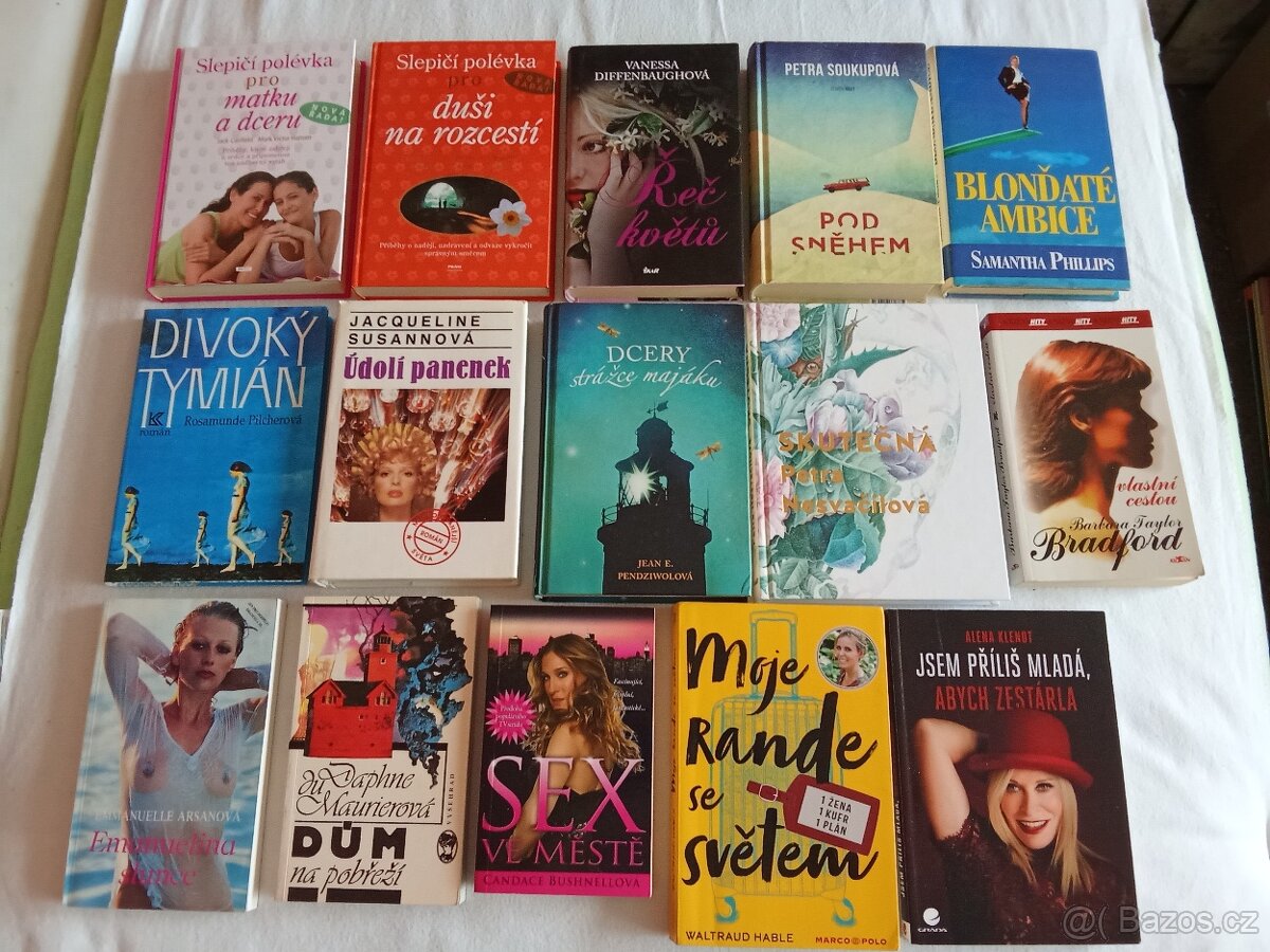 Cena: V textu. Prodám mix knih pro ženy: - SLEPIČÍ POLÉVKA PRO DUŠI NA ROZCESTÍ, JACK CANFIELD. 1x čtená, ve výborném stavu. Cena 60KČ, - SLEPIČÍ POLÉVKA PRO MATKU A DCERU, JACK CANFIELD. 1x čtená, ve výborném stavu. Cena 60Kč, - ŘEČ KVĚTŮ, VANESSA DIFFENBAUGHOVÁ. 1x čtená, v bezvadném stavu. Cena 50Kč, - POD SNĚHEM, Petra Soukupová. Čtená, v pěkném stavu. Cena 70Kč, - BLONĎATÉ AMBICE, SAMANTHA PHILLIPS. 1x čtená, v pěkném stavu. Cena 40Kč, - DIVOKÝ TYMIÁN, Rosamunde Pilcherová. 1x čtená, v bezvadném stavu. Cena 50Kč, - ÚDOLÍ PANENEK, JACQUELINE SUSANNOVÁ. Čtená, v pěkném stavu. Cena 50Kč, - DCERY STRÁŽCE MAJÁKU, Jean E. Pendziwolová. 1x čtená, ve výborném stavu. Cena 50Kč, - SKUTEČNÁ, PETRA NESVAČILOVÁ. 1x čtená, ve výborném stavu, jak nová. Cena 150kČ, - VLASTNÍ CESTOU, BARBORA TAYLOR BRADFORD. 1x čtená, ve výborném stavu. Cena 50Kč, - EMANUELINA SLUNCE, EMMANUELLE ARSANOVÁ. 1x čtená, v pěkném stavu. Cena 50kČ, - DŮM NA POBŘEŽÍ, DAPHNE DU MAURIEROVÁ. 1x čtená, ve výborném stavu. Cena 40Kč, - SEX VE