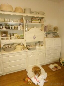 Prodám dřevěnou jídelnu,4 ks,nalakovanou bílo smetanovou barvou.K jídelně je 6 ks dřevěných židlí,tmavé dřevo.Židle jsou v původním stavu,nejsou nalakované.Délka jednoho dílu jídelny je 75 cm,hloubka 48 cm,výška 190 cm.Nutný vlastní odvoz.Po domluvě lze vyzvednout v Praze.
