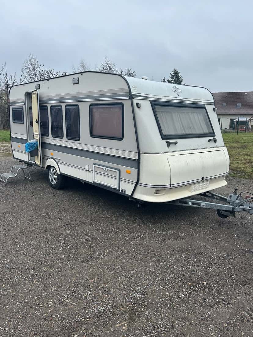 Prodám karavan Hobby 12E.Vybava dle fotek. R.v.1991,Hobby 12E,12/2025 STK,WC, nezávislé plyn. topení,ledička 12V,220V,plyn,předstan,markýza, krycí plachta přes celý karavan,