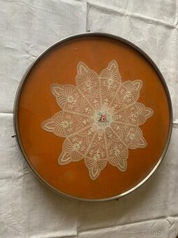 otočný tác v bezvadném stavu, průměr 50 cm, pod sklem je krajková dečka