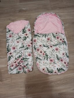 Set pro miminko,obsahuje zavinovačku,hnízdečko,2 spací pytle 0-9měsíců a 9-18m,ruķávník na kočárek,2x prostěradlo do kočárku,fusak do kočárku,podložku do sporťaku+ polštářek,deku,podložku na přebalování textilní,fusak do vajíčka v jednom dekoru.Vady- chybí šňůrka u hnízdečka,dva vytrhlé druky na spacím pytlu,lehce zažloutla podložka do sporťáku,značka LaMillou,něco šito na zakázku,cena 1800,- + poštovné