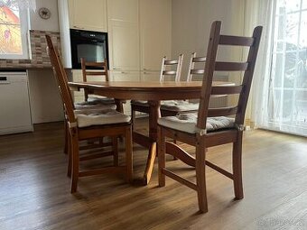 prodám dřevěný jídelní set, obsahuje rozkládací stůl a 6 ks židlí (jedna židle s drobnou vadou - chybí jedna bederní příčka), zakoupeno v Ikea, set má běžné známky opotřebení, ale jinak plně funkční a v dobrém stavu.