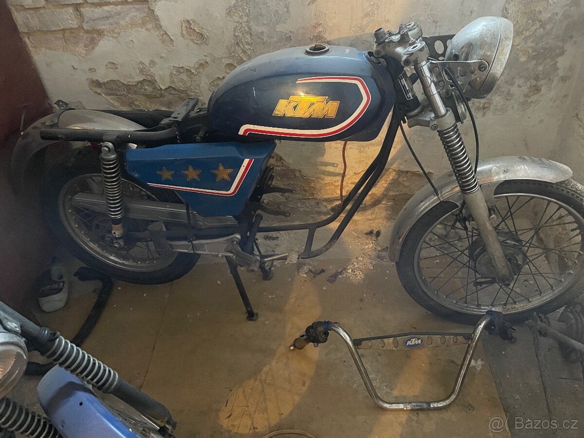 Prodám tuhle raritu - KTM 80 chopper. K prodeji je pouze to, co je na fotografiích. Ceny kompletních motocyklů tohoto typu se pohybují v rozmezí 2000 - 4000,- EUR. Co chybí: Motor,,sedlo, levý boční kryt a zadní lampa. Palubní desku dohledám.