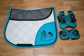 Prodám dečku bílo-tyrkysovou s protiskluzem, vel. ponny a kamaše také na poníka v tyrkysové barvě. Dečka použitá pouze dvakrát na závodech. Cena za sadu.