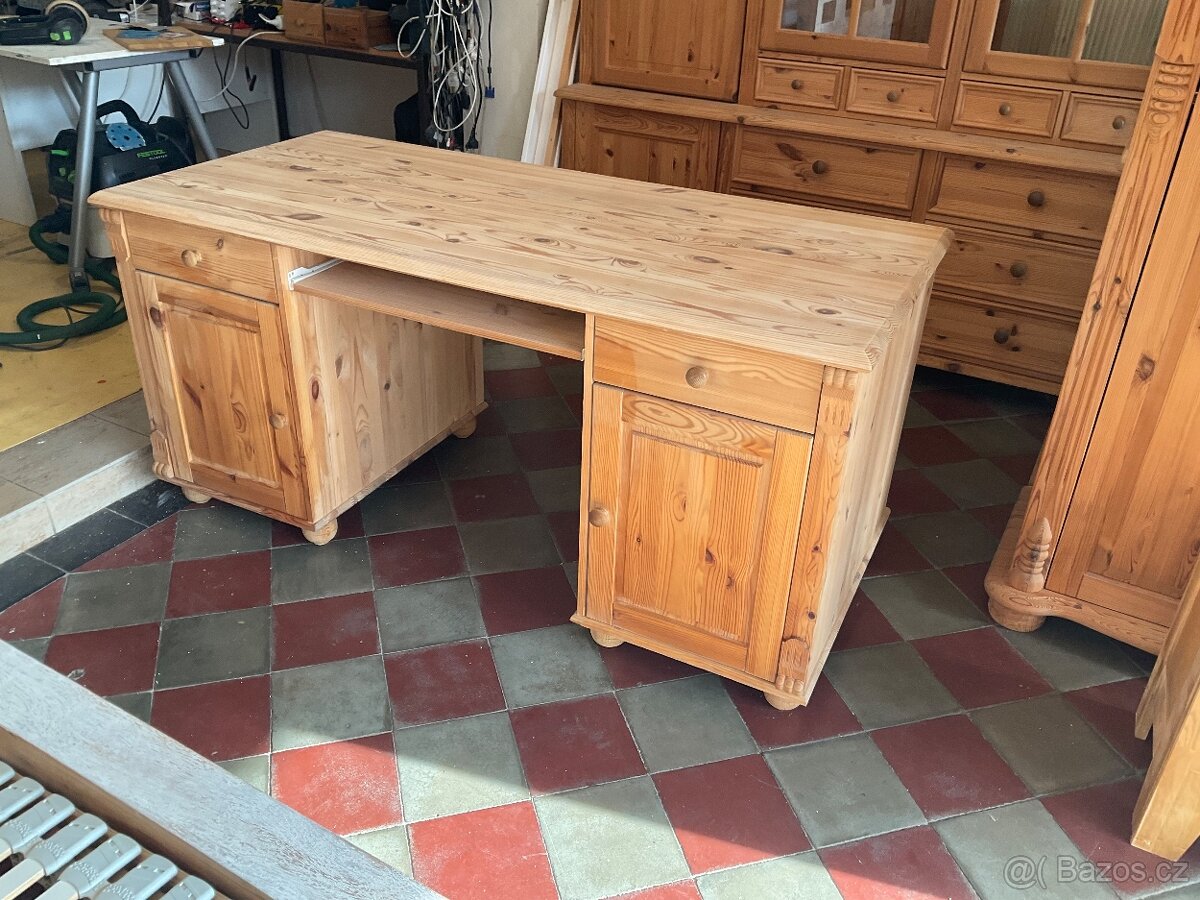 Prodám psací stůl materiál voskované borovice plný silný Masiv rozměry 155 krát 72 a výška 74 cm velmi dobrý stav prohlédněte si také ostatní naše nabídky děkuji