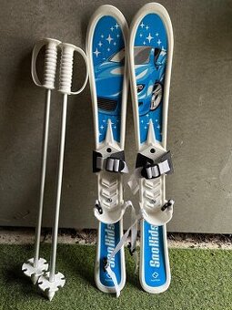 Plastové lyže pro malé děti. Upínají se přes boty. Užili jsme ve věku 2-3 roky. Krásně drží nožku. Patu lze odšroubovat a mají ze sjezdovek běžky :-)