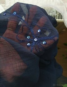 Nádherný, v Indonésii ručně vyrobený kostým - kalhoty + top - v barvě tmavě modré noční oblohy, lehounký a tenký jako pavučinka. Kostým je zdobený krásnými výšivkami, flitry a korálky. Kalhoty se zavazují šňůrkami v pase, rozparek je tudíž po celé délce nohy. Univerzální velikost. Měla jsem na sobě pouze jednou na vystoupení - TOP stav. SLEDUJTE I MÉ DALŠÍ INZERÁTY!!!