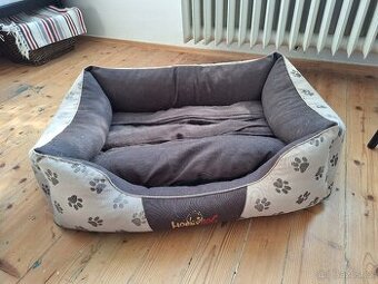Prodám starší pelíšek s tlapkami, pro menšího až středního psa. Odolný materiál. Pratelný potah okrajů i vnitřku. Rozměry: 90x65cm vnější a 55x45cm vnitřní. Původní cena 1500 Kč.