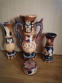Prodám jako celek dřevěné vyřezávané vázy a dózu. Nejvyšší váza měří 45 cm. Osobní odběr nebo platba předem, posílám Balikovnou, Zásilkovnou nebo poštou.