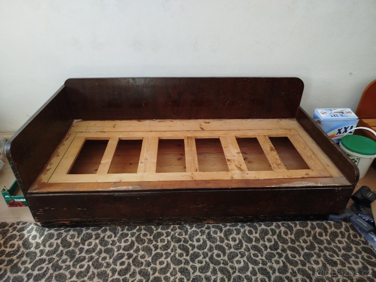 Starší dřevěná válenda bez matrace, pevná konstrukce, vhodná na chatu nebo k renovaci.