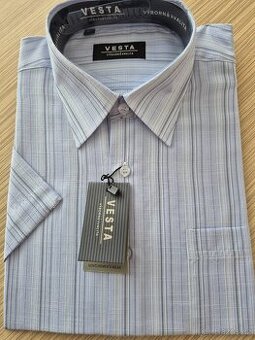 Prodám novou pánskou košili značky VESTA – Gentlemen’s Wear, nikdy nošenou, s originální visačkou. • Barva: světle modrá/šedo-modré proužky • Styl: společenská / business • Rukáv: krátký • Límec: klasický (kent) • Materiál: bavlna • Velikost: 41 Košile je elegantní a vhodná do kanceláře, na schůzky i slavnostní příležitosti.