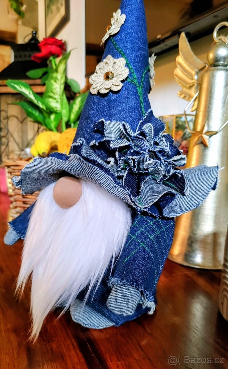 Vánoční skřítek 38x12cm, celošitý(žádné kartony či lepení), volně stojící. 100%bavlná/ džínovina. Pouze jeden kus/ můj originál.