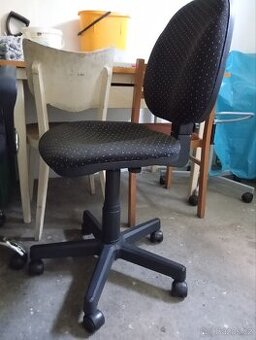 Židle k psacímu stolu, píst drží jenom do 35 kg, kolečka jezdí dobře, je vyčištěná, potah velmi pěkný a zachovalý