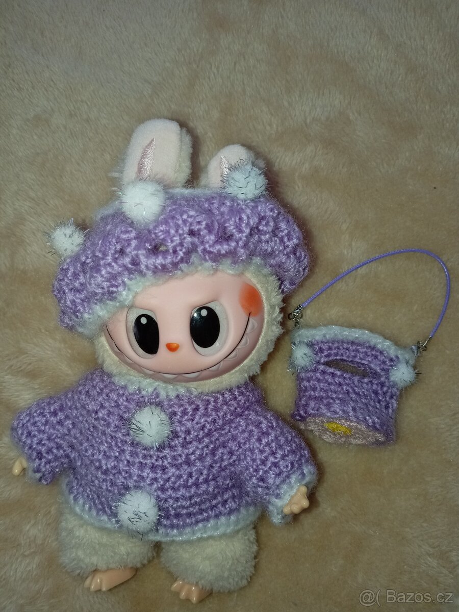 Fialková háčkovaná souprava pro Labubu: Svetřík v zadu na knoflíček, oblékání přes hlavu, nebo nožičkami. Čepička s otvorem pro ouška, tvar baretu. V lemu je gumička pro lepší držení a formování. Svetřík a čapka mají olemování z jemné, chlupaté a lehce třpytivé příze a dozdobené bambulkami s lurexem. Souprava je doplněna kabelkou přes rameno (z umělého pleténého provázku, na konci s karabinkami) které lze vyjmout. /plyšák není součástí prodeje/