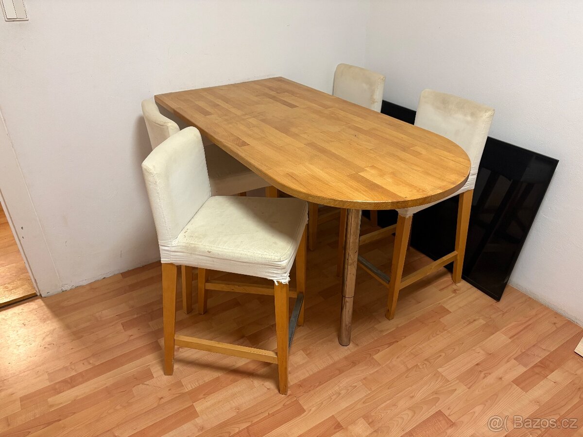 Prodám barový stůl + 4 židle (potahy nutné vyčistit nebo koupit nové-IKEA) Rozměr stolu 140x70 výška stavitelná. Výška židle 65. Cena za komplet 2500,-