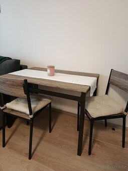 Prodám jídelní stůl se čtyřmi židlemi.Rozměry: D-110cm,Š-70cm. Stůl je nepoškozený jen na jedné židli malé poškození od škoubku.