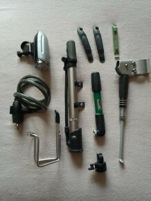 Cena: V textu. Prodám věci na kolo. 2x malá pumpa. Hliníkový stojan. Košík na láhev.Světlo přední. Zvonek. Zámek na kolo. Montážní páky 3 ks. 400 Kč + poštovné