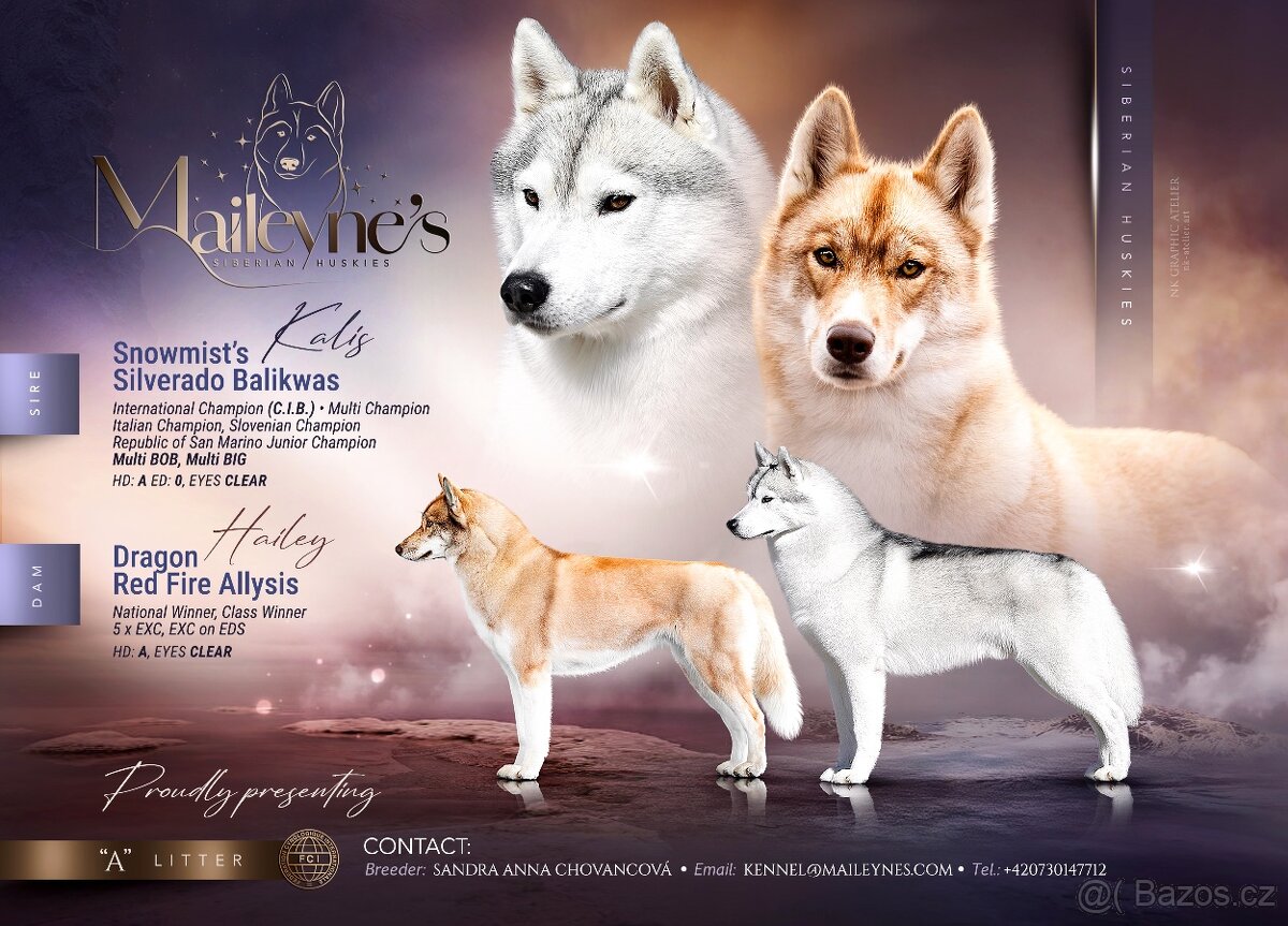Cena: Dohodou. Štěňátka sibiřského husky s PP po výstavně i sportovně vedených rodičích. Chovatelská stanice Maileyne’s přijímá rezervace na štěňátka plemene sibiřský husky s průkazem původu, narozená 6. 2. 2026. Rodiče: Otec: Snowmist’ Silverado Balikwas Matka: Dragon Red Fire Allysis K dispozici: 🐾 2 šedobílí pejsci 🐾 3 agouti fenečky Štěňátka jsou vhodná pro sportovně založené rodiny, aktivní majitele, k dětem, jako miláčci rodiny, ale také pro zájemce o psí sporty či výstavy. Do nových domovů budou odcházet na začátku dubna, řádně socializovaná, zvyklá na běžný ruch domácnosti. Budou několikrát odčervená, očkovaná, čipovaná, vybavená petpasem a dostanou s sebou bohatou výbavičku. Samozřejmostí je doživotní chovatelský servis. Od narození se štěňátky pracujeme dle konceptu Puppy Culture, získávají základy „emergency recall“ a dbáme na jejich vyrovnaný psychický vývoj. Sibiřský husky je pracovní plemeno, které vyžaduje dostatek pohybu, zaměstnání a důsledné vedení. Prosíme budoucí majitele,