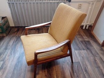 Toto křeslo je retro čalouněné křeslo ze 60. let, často spojované s designem Jiřího Jiroutka nebo výrobcem Interiér Praha. Detaily produktu Styl: Design odpovídá stylu mid-century modern, který byl populární v Československu v 60. a 70. letech 20. století. Materiál: Má masivní dřevěnou konstrukci a dřevěné područky. Výrobce: Častým výrobcem tohoto typu nábytku byl n.p. Interiér Praha.