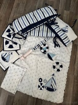 Prodám sadu do postýlky s námořnickým motivem. Dovezena z USA. Měli jsme ji u babičky, používaná byla málo. Takže fleky, které se tam někde objevují jsou spíš od skladování. Sada obsahuje: -Lehčí přikrývku 110x80cm -Prostěradlo na matraci 120x60cm (sem tam flek) -Mantinely na postýlku 120x60 (sem tam flek) v jednom rožku chybí mašle na zavazování. -Kolotoč nad postýlku-4 plyšové hračky. Míval i strojek se zvonkohrou ale jednou to syn přetočil a prasklo péro -Kapsář na plenky -Měkké obrázky -polštářek u toho vůbec nebyl.
