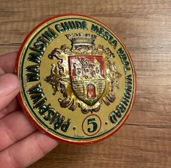 Stará plechová cedule ŽEBRAČENKA přispívá na místní chudé města Královské Vinohrady, průměr 10,5 cm, velmi pěkný stav, originál. Cena 450,-, mohu poslat po ČR a na Slovensko. [email protected]