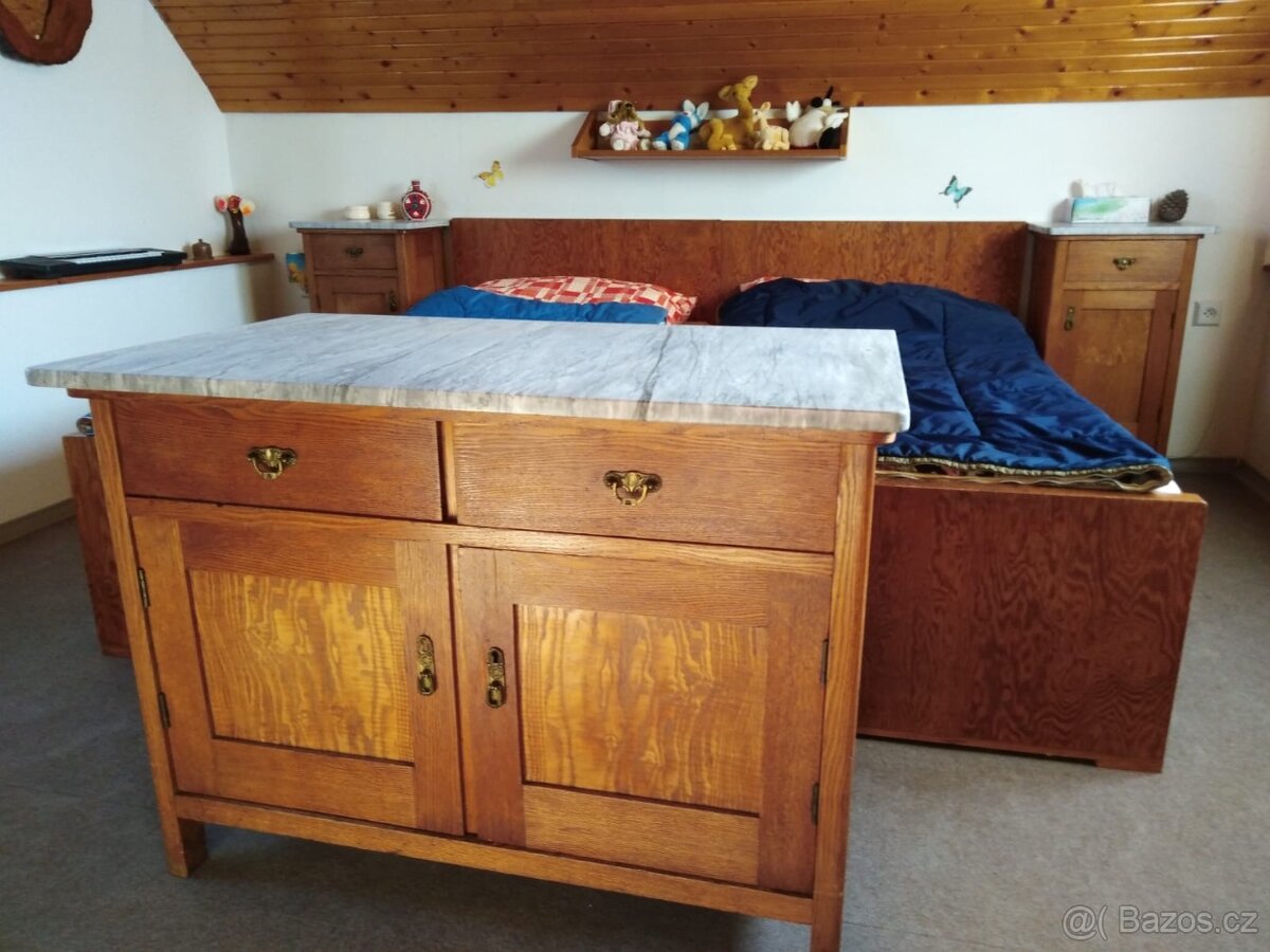 Nabízím starožitnou ložnici - manželské postele bez matrací (šíře 2 metry) + starožitnou komodu s krásnou mramorovou deskou a dva starožitné noční stolky s pravým mramorem, s původním kováním, vše krásně zachovalé a funkční, k okamžité dispozici. Zhlédnutí možné po dohodě s majitelem.