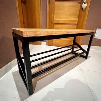 Designový botník – dub & černý kov Moderní a poctivě zpracovaný botník v industriálním stylu. Kombinace masivního dubu a pevné kovové konstrukce dodá interiéru nadčasový vzhled. Rozměry: 800 × 400 × 400 mm Konstrukce: kov, matný lak RAL 9005 Horní deska: masivní dub 30 mm, olejovaný Stav: nový / zakázková výroba Vhodný do předsíně, chodby nebo loftového interiéru.