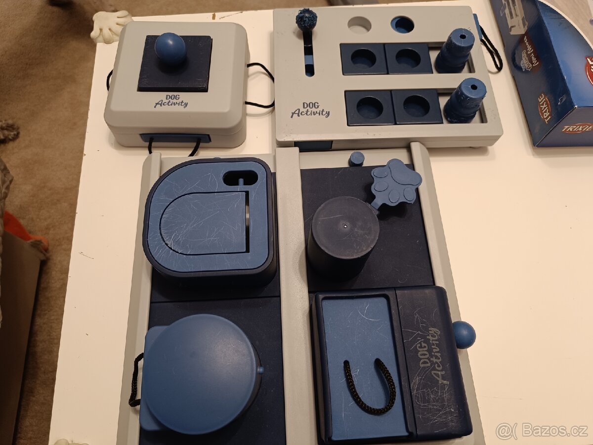 Stačí naplnit mlskama a nechat psa se bavit. Je to používané, tedy okousané a oškrábané. Jedna záklopka nefunguje, je ulomená páčka (viz foto s prstem).