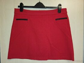 Hrubsi pruzny material, zapinani na zip, ale jde oblect i bez rozpinani. Cervena, foceno s bleskem i bez, ale barvu tezko utrefit. Tuto jsem parkrat mela, ale je porad pekna. Kapsy jsou falesne. Delka 42 cm Pas 2x 43 cm.
