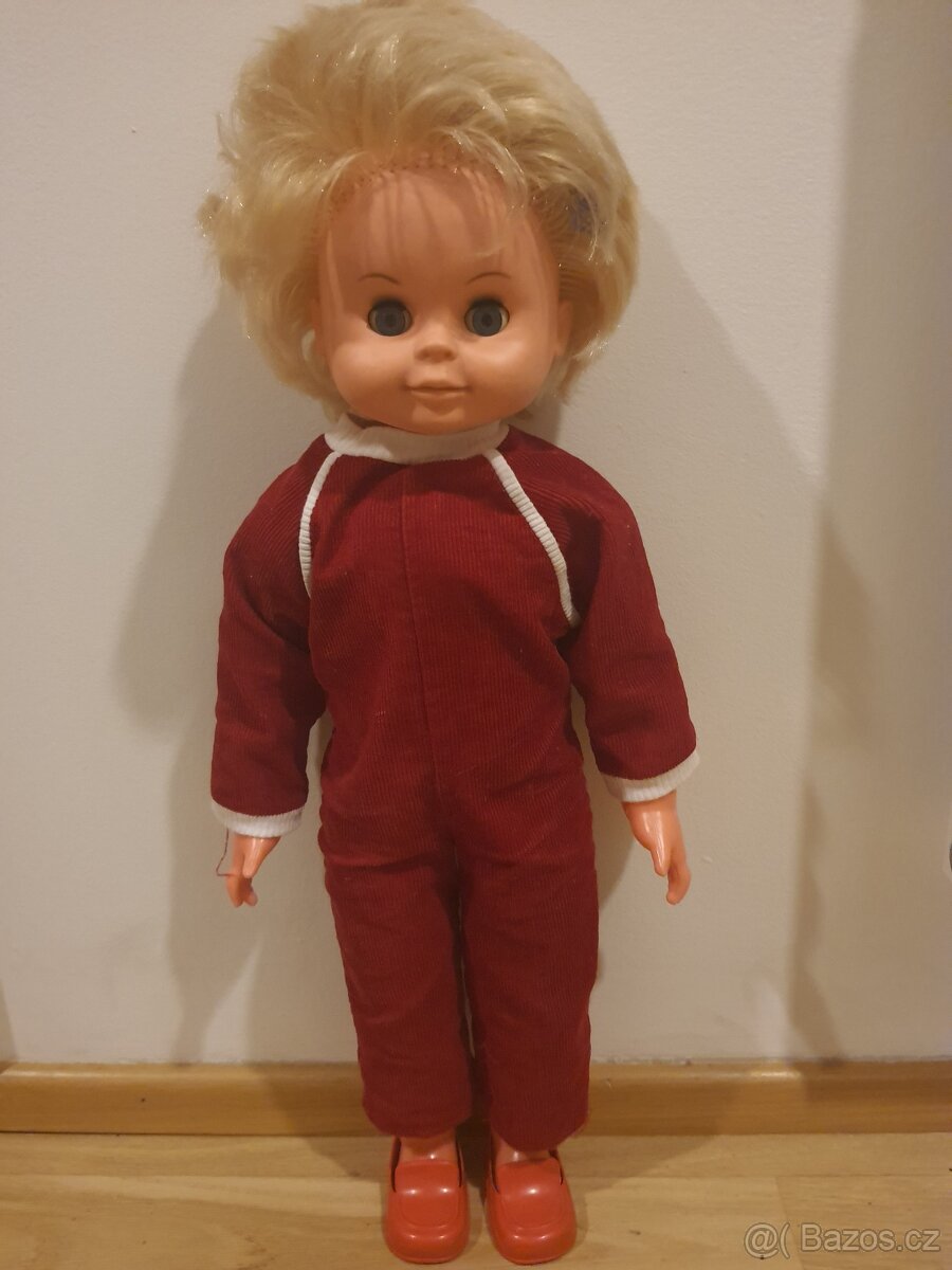 Cena: Nabídněte. Panenka z 80.let. Chodí a brečí. Kombinéza, ponožky a botičky jsou původní. Žlutý komplet je taky z té doby. Osobní předání nebo poštou