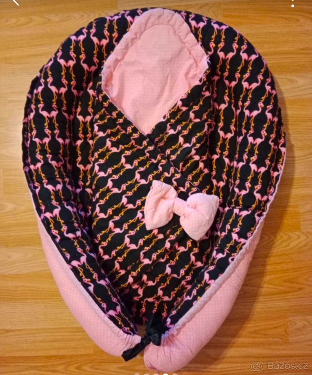 Kombinace černé a růžové. Na jedné straně plameňáci, na druhé puntíky.