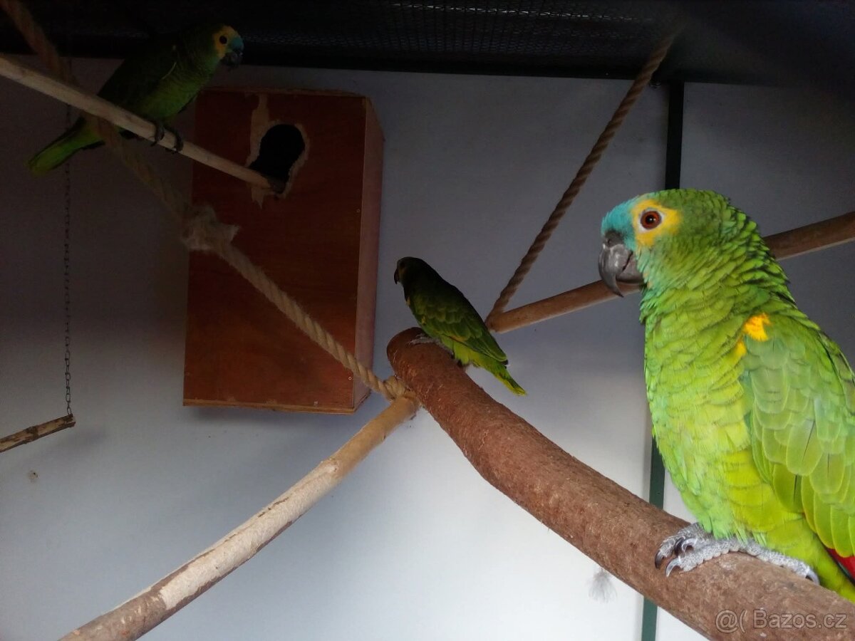 Prodám amazoňany modročelé – 1 samice Nabízím k prodeji amazoňany modročelé (Amazona aestiva),už se sami krmí. Již máme jen jednu samici. Papoušci jsou zdraví, vitální,nejsou ručně dokrmení, ale máme zkušenosti s ochočením. Vhodní jak na chov, tak jako společníci. Cena: 6000 Kč za kus.