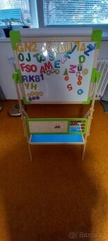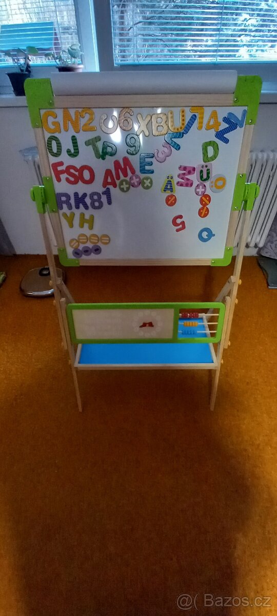 Oboustranná tabule na hraní a učení, psaní a počítání včetně počítadla, hodin na učení s pohyblivými ručičkami, abecední tabulkou. Lehce otočná tabule, bezpečně fixovatelná pomocí aretačních pojistek Velká role papíru, na kresleni, spolu s magnety čísla, znaménka, abeceda. Bez papíru lze použít i křídu. Velmi zachovalá. Původní cena 790Kč. Nejlépe osobní odběr.