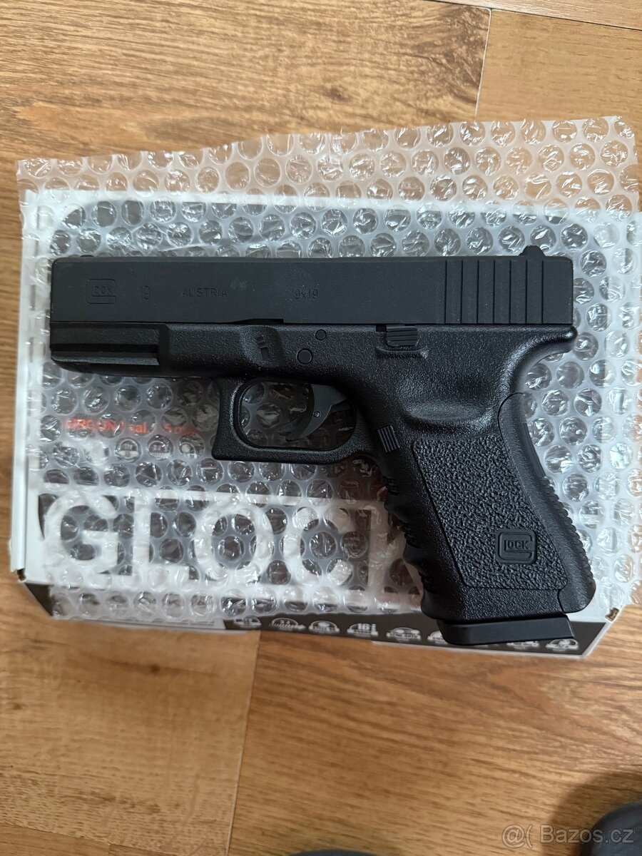 Polymerový Glock 19, 1:1 Umarex, vzduchovka na ocelové broky 4,5mm, pohon Co2. Výborný stav. Osobní předání nebo zásilkovna platbou předem na účet.