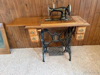 Nabízím starožitný šlapací šicí stroj Singer R.C. Schutzmarke Verbesserte, vyrobený okolo roku 1910–1920. Stroj je kompletní, s originálním litinovým podstavcem, šlapacím mechanismem a dřevěným stolkem se šuplíky. Na povrchu je zachována bohatá dekorativní výzdoba typická pro starší modely. Stroj má poškozen dřevěný rámeček mezi šuplíky. O ceně je možné jednat