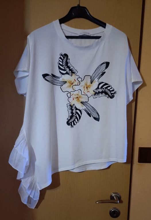 Bílé tričko s volánem, asymetricky šité. Jednou oblečené, bez vad. V butiku PC 590,-, nechám za 260,-. Délka 56/80, hrudník 116. Krásné romantické triko, neunosím. Posílám zásilkovnou.