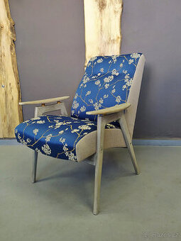 Představujeme retro křeslo po renovaci v originálním provedení. Opět kompletní renovace od kostry, včetně dřevěných částí. Tentokrát jsme se nemohli rozhodnout pro výběr barvy dřeva, tak vyhrál „odřený“ styl. Základem je odstín střední ořech překrytý světle krémovou křídovou barvu, která je následně probroušena. Finální povrch je tvořen kvalitním tvrdovoskem. Výsledek je velmi originální. Látku jsme vybrali od Kolovratu, jde o modrou látku se vzorem třešňových větviček se světlými květy. Boky jsou ve světlé hrubší látce. Jako celek působí velmi elegantně. Křeslo máme k dispozici v jediném exempláři.