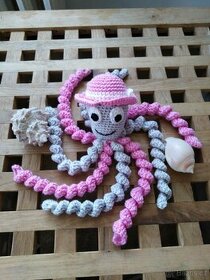 Háčkovaná chobotnice nejen pro nedonošená novorozeňátka. Celková délka chobotničky je 23 cm, délka chapadel 16 cm. Materiál 100% bavlna. Hračku lze prát v pračce na 40 °C, je plněná kuličkovým dutým vláknem. Možno objednat jakoukoli barevnou kombinaci, záleží jen na Vaší fantazii.