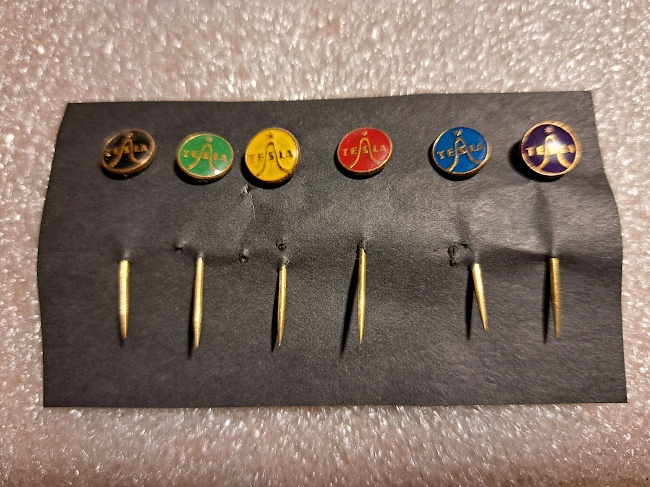 Cena: Dohodou. Prodám malé odznaky Tesla 6ks + 1ks bílý, není na fotce